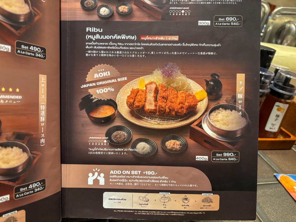 เมนูมีให้เลือกจนตาลาย แต่เรามาสะดุดตากับ “Ribu” หมูสันนอกคัดพิเศษจากฮอกไกโด ที่หนึ่งวันขายแค่ 20 ชุดเท่านั้น เลยจิ้มเอาเมนูนี้แหล่ะ พนักงานบอกว่าจานนี้ชิ้นใหญ่ กิน 2 คน อิ้มแปล้ ให้สั่งเพิ่มแค่เซ็ตข้าว
