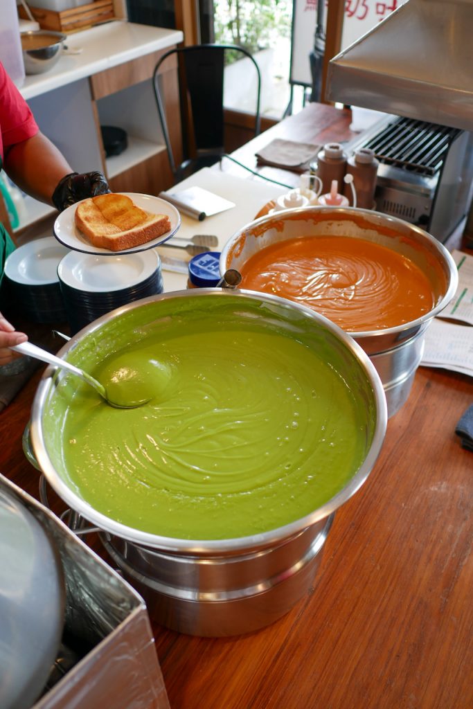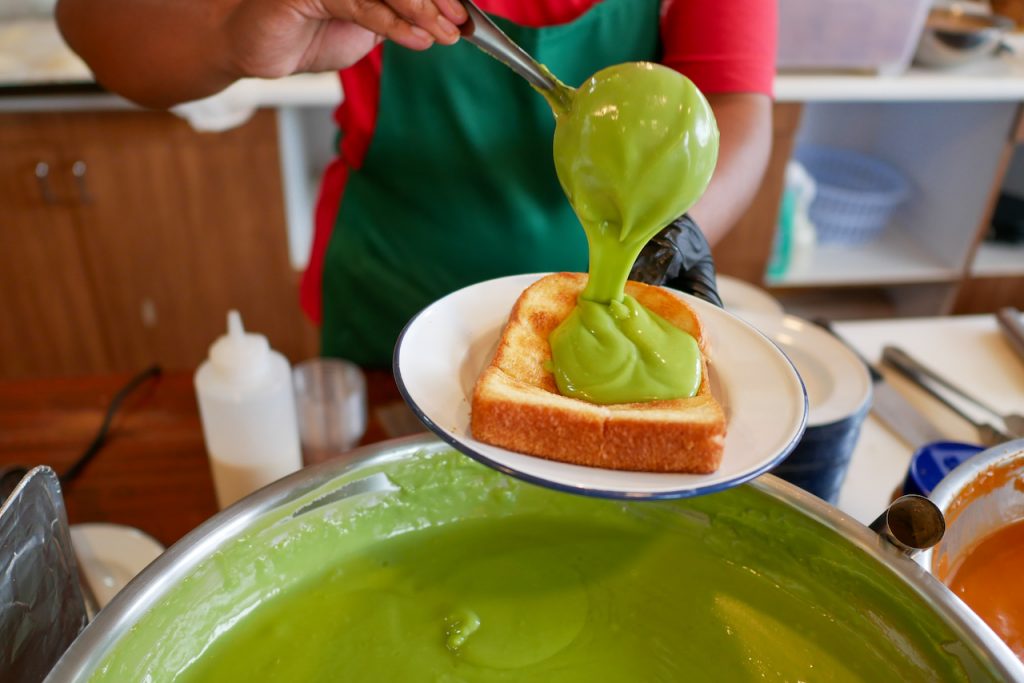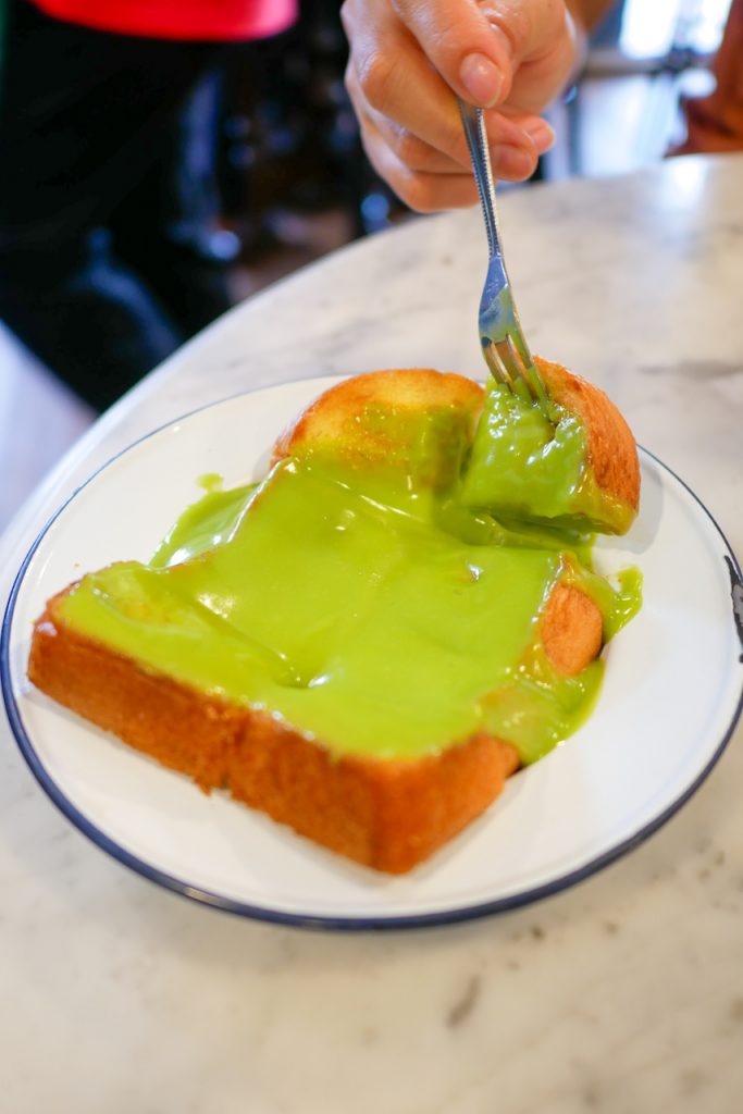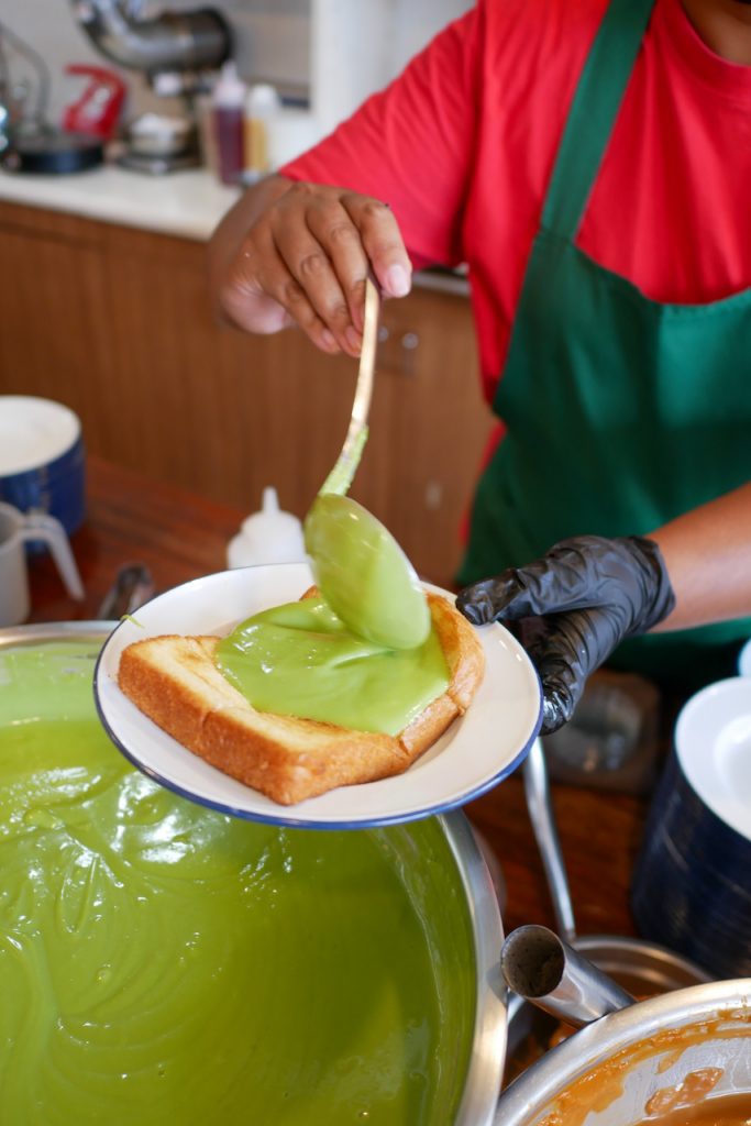 เมนูวันนี้ เลือก Best Seller ทั้ง 2 เมนู … จานแรกเป็น “ขนมปังสังขยาใบเตย” เมนูเบสิกที่สั่งกันเกือบทุกโต๊ะ ขนมปังแผ่นหนาและใหญ่ปิ้งร้อนหอมกรุ่น ราดด้วยสังขยาใบเตยสีเขียวชุ่มฉ่ำ หวานและหอมถูกใจ