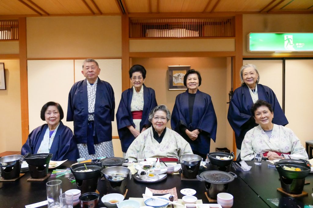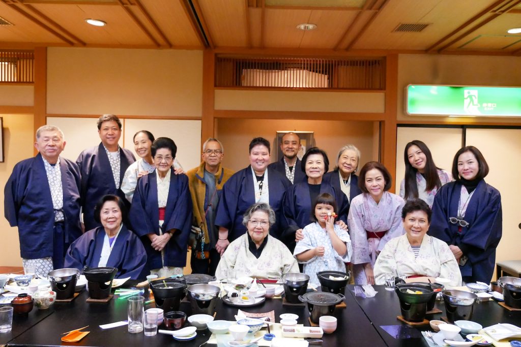 สมาชิกในกลุ่มรวมตัวถ่ายรูปหมู่ในชุดยูกะตะ ดินเนอร์ Kaiseki คอร์สอาหารญี่ปุ่นแบบดั้งเดิม ที่เรียวกัง Hotel Kohakuen ณ เมือง Yamanoshi