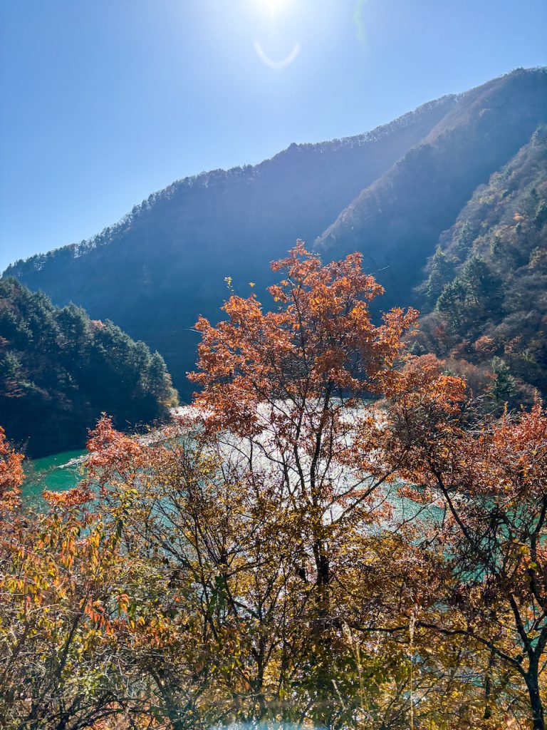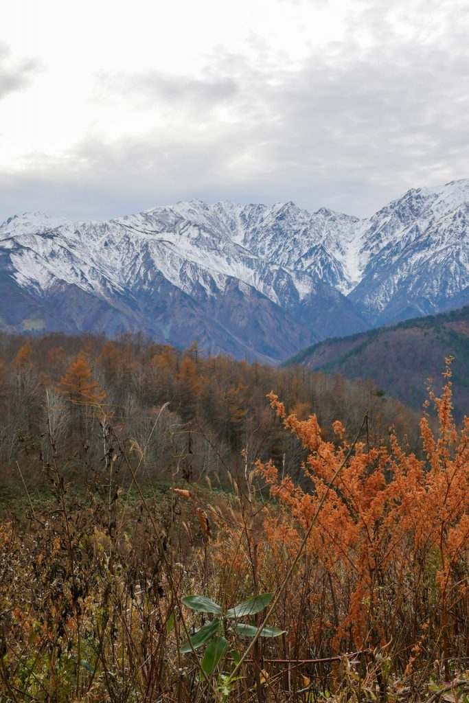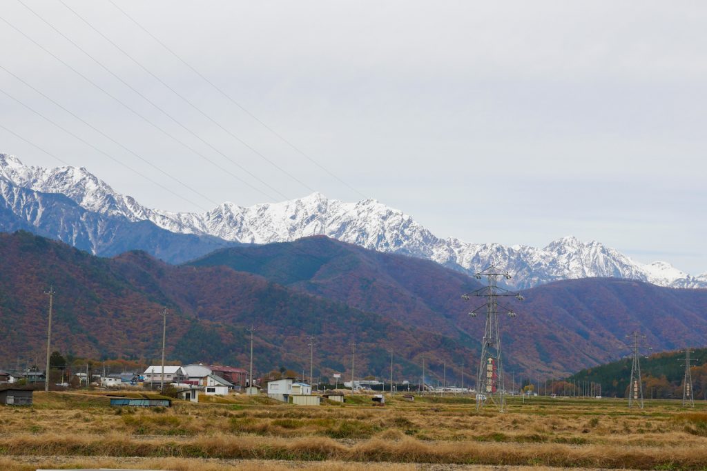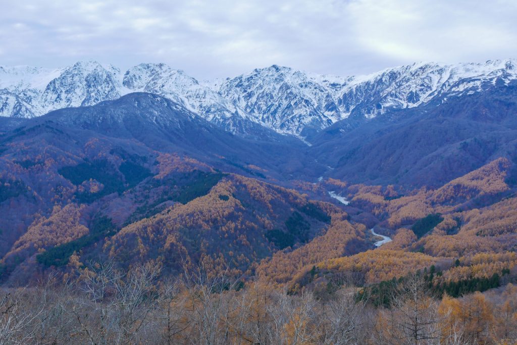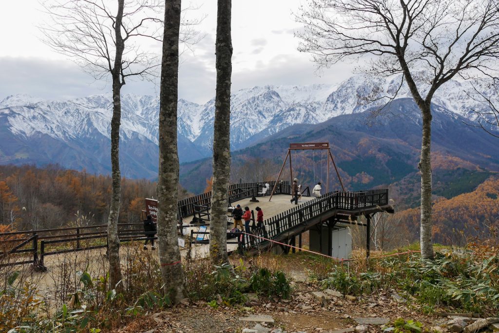ขึ้นกระเช้าไปที่ Hakuba Iwatake Ropeway จุดชมวิวเจแปนแอลป์ อากาศเย็นสบายประมาณ 10 องศา ฟ้าเปิดให้เห็นแนวเทือกเขาที่มีหิมะสีขาวปกคลุม เป็นปรากฏการณ์ซันดันโคโย Sandan Koyo หรือ วิว 3 สี ประกอบด้วย สีขาวของหิมะ สีส้ม-แดงของใบไม้ที่เปลี่ยนสี และสีเขียวของใบไม้ที่ยังคงเขียวขจี