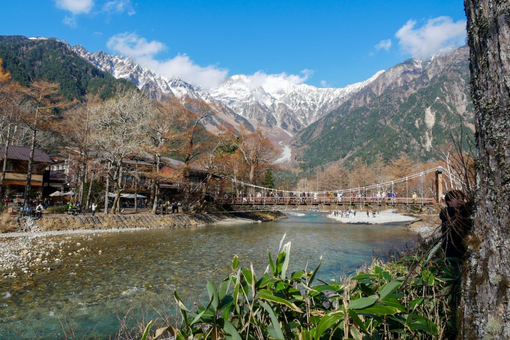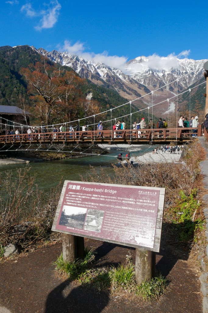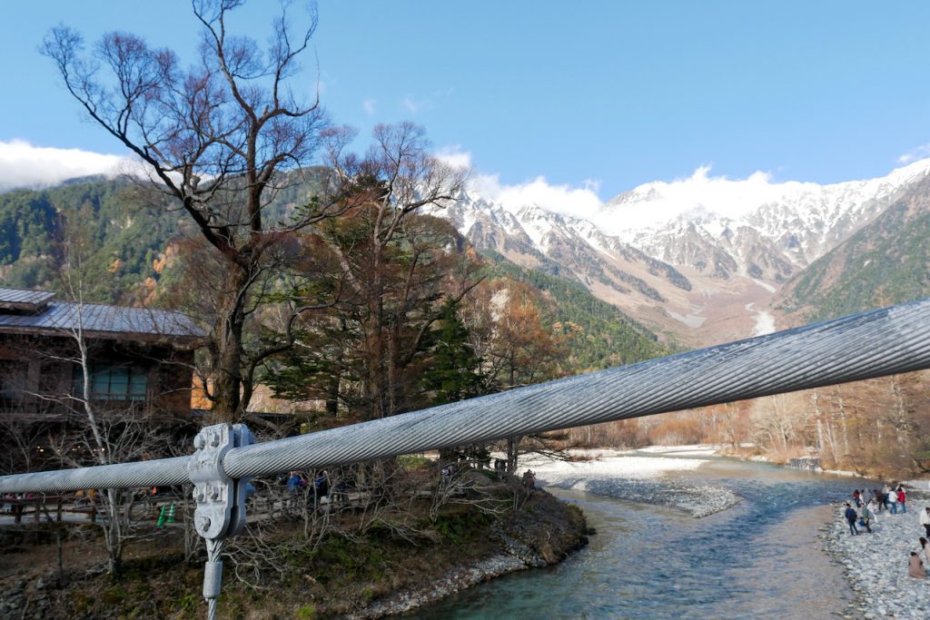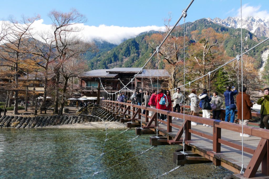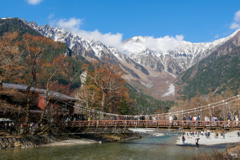 เพื่อพบกับภาพไฮไลต์ของสะพานแขวนพาดผ่านแม่น้ำอาซุสะ โดยมีความงามของเทือกเขาโฮทากะเป็นพื้นหลัง