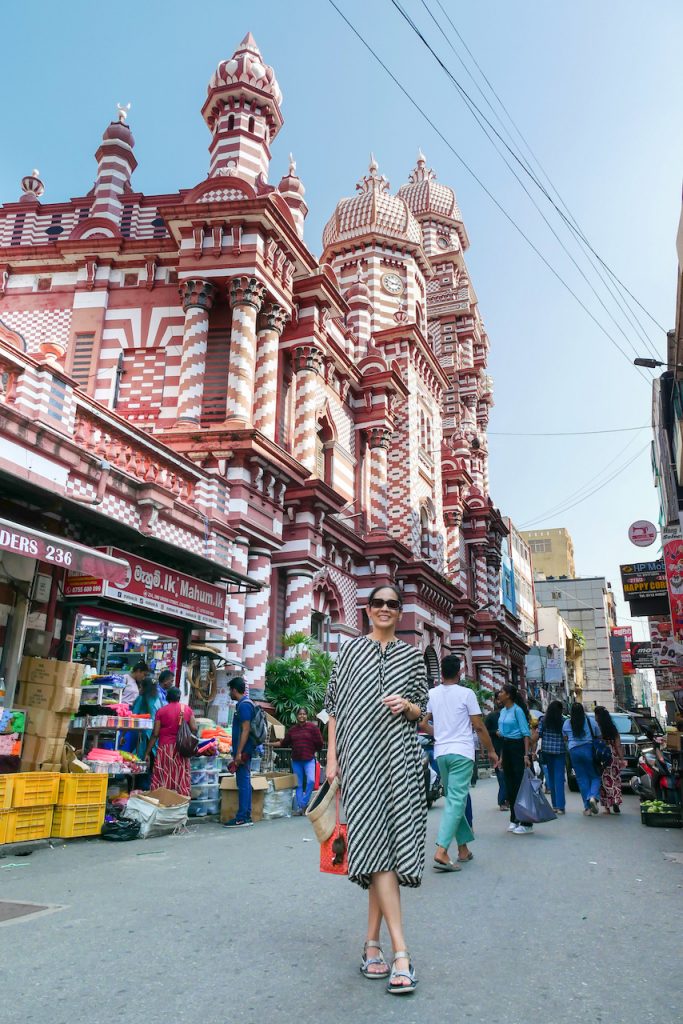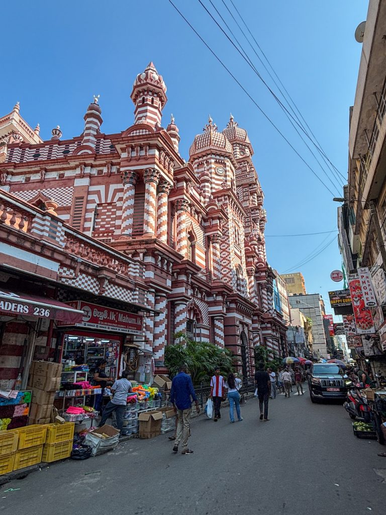 หลังจากเช็คอินที่โรงแรมเสร็จ เราก็เรียกรถแท็กซี่ผ่าน Pick-Me-Up Application (เหมือน Uber และ Grab) มายังมัสยิดแคนดี้เคน (Candy Cane) สีแดง-ขาว ที่ตั้งอยู่กลางตลาด Pettah Market ตลาดใหญ่ของโคลอมโบ