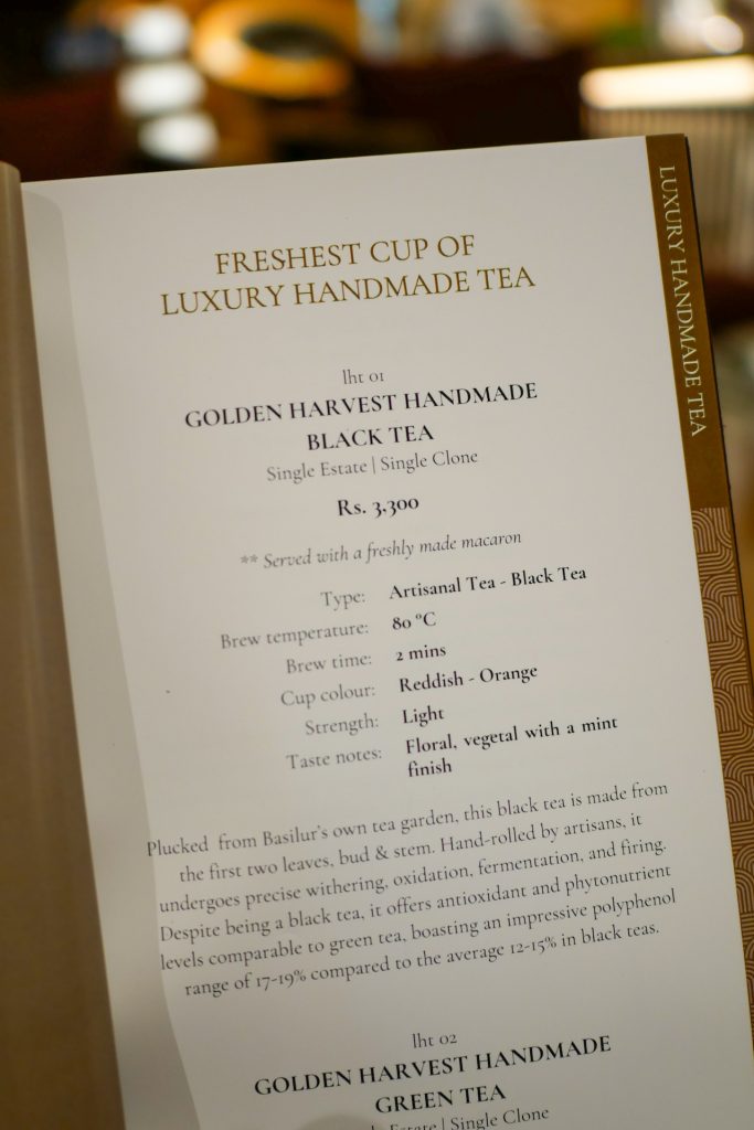 สุดท้าย เราอยากให้ลองใช้เวลาชิลๆ จิบชาซีลอนคุณภาพของ Basilur Tea Lounge ร้านชาชื่อดังของ Dr. Gamini Abeywickrama ที่มีใบชาให้เลือกมากมาย แถมแพ็คเก็จจิ้งก็หรูหราประหนึ่ง Harrods ของศรีลังกา นอกจากนั้นหน้าร้านยังมีสาวศรีลังกานวดใบชาให้ชม สะท้อนความมั่นใจของสินค้ามาสู่ลูกค้า อาหารในร้านมีทั้งคาวและหวาน เราเลือกเซ็ตชา Golden Harvest Handmade Black Tea (3,300 รูปี) ที่เสิร์ฟพร้อมมาการองชิ้นเล็กในถ้วยชาสีทอง ถือเป็นการจบทริปโคลอมโบในครั้งนี้อย่างแฮปปี้เอนดิ้งค่ะ (https://lk.basilurtea.com/pages/basilur-lounge-one-galle-face)