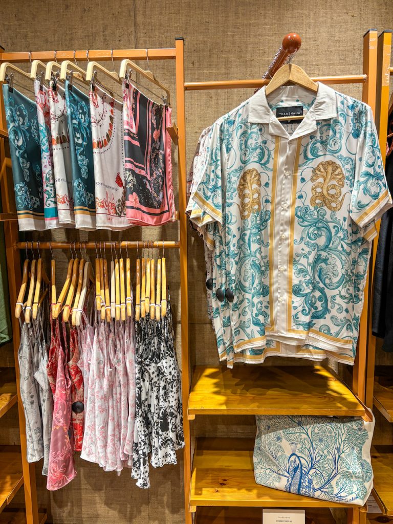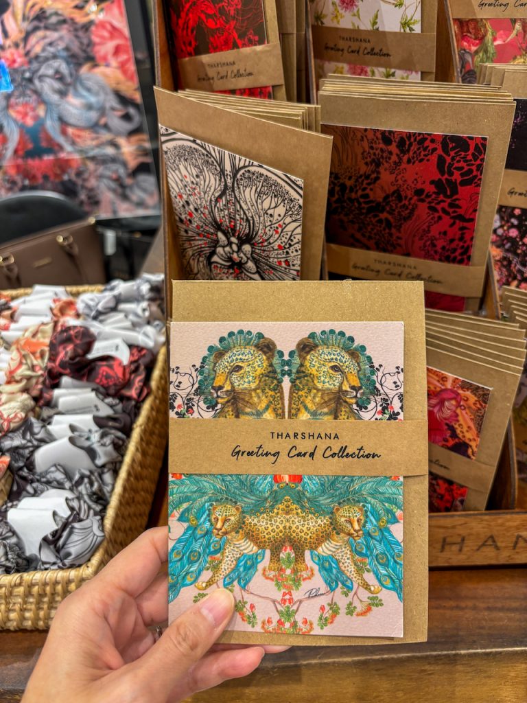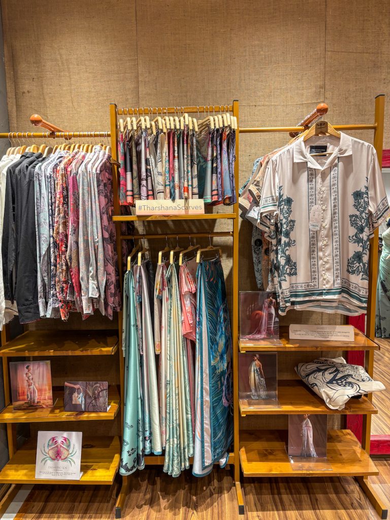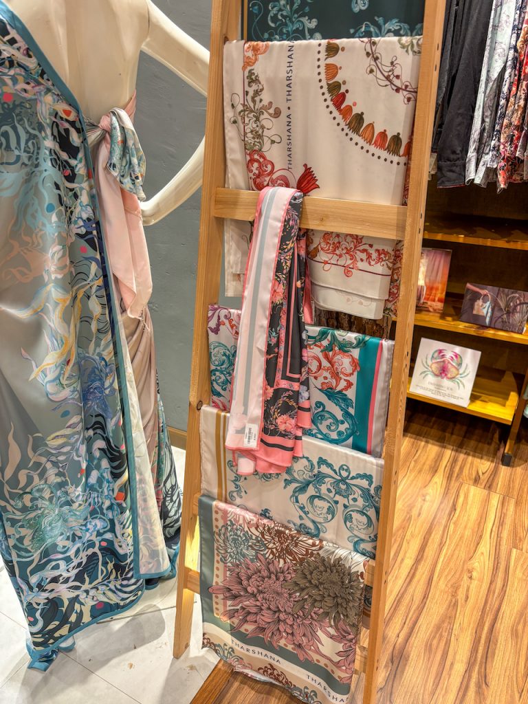 หรือถ้าใครชอบสินค้าของดีไซเนอร์ท้องถิ่น เราแนะนำ Tharshana ที่ขายในช้อป Firefly ชั้น 2 ความโดดเด่นของสินค้าอยู่ที่ลวดลายของผ้าไหม ที่ดีไซน์เนอร์วาดเองจากวัฒนธรรมของชาวศรีลังกา ดึงเอาดอกไม้ ศาสนา และสัตว์ต่างๆออกมารังสรรค์เป็นผ้าพันคอ เสื้อผู้ชาย ผู้หญิง การ์ดอวยพร และของกระจุกกระจิกอื่นๆ สุดท้ายเราได้ผ้าพันคอกลับมาฝากคุณแม่ เพื่อนในกลุ่มก็ฝากซื้อกันหลายชิ้น สินค้าของ Tharshana น่าใช้และมีเอกลักษณ์มากจริงๆ (https://tharshana.com)