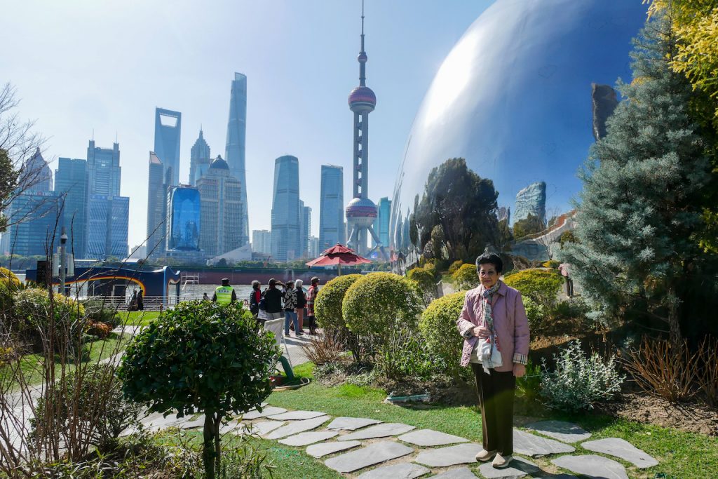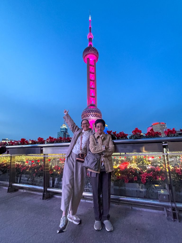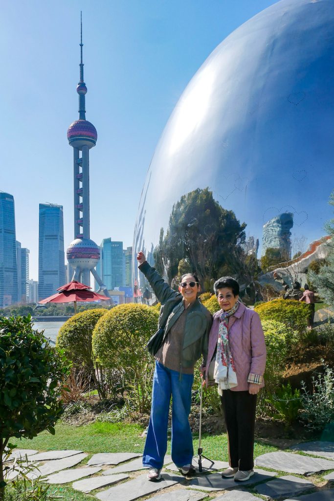 จุดเช็คอินแรกอยู่ที่ North Bund สวนสาธารณะริมแม่น้ำหวงผู่ ที่มี Silver Egg ไข่สีเงินลูกใหญ่สะท้อนกับแสงแดด โดยมีภาพของหอไข่มุกตะวันออกและตึกสูงของฝั่ง Pudong อยู่ด้านหลัง หลายคนเลยนิยามภาพนี้ว่าเหมือนโลกอนาคตของฉากหนังไซไฟ คิวถ่ายรูปเช้านี้สั้น นักท่องเที่ยวคนไทยที่รอคิวช่วยถ่ายรูปให้เราสองแม่ลูกค่ะ (จากทางเข้าสวน จุดจอดรถ เดินประมาณ 50 – 100 เมตรเท่านั้น คุณแม่เดินเองไม่ต้องใช้รถเข็นค่ะ)