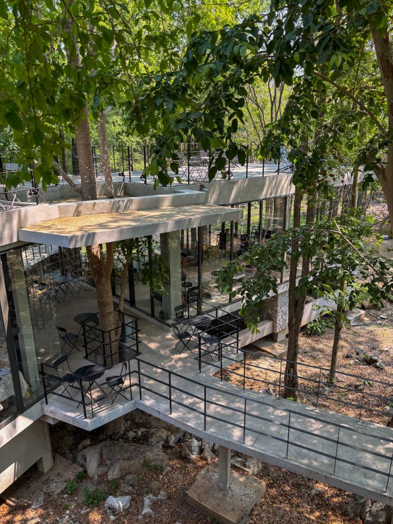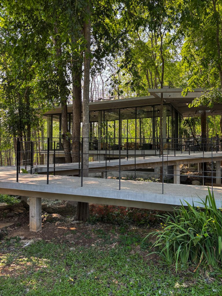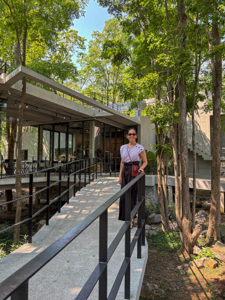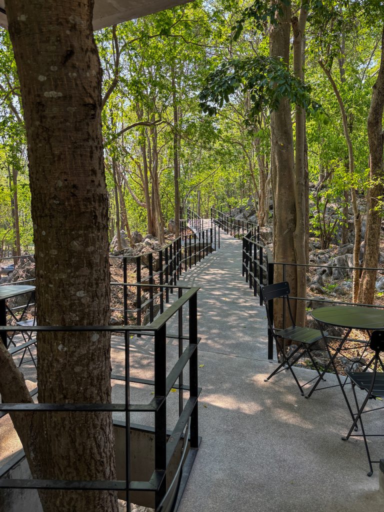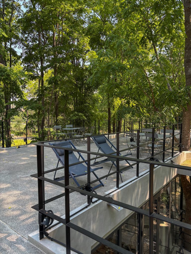 หากมองไปด้านข้าง เราจะเห็นทางเดินทอดยาว อารมณ์เหมือนเดินปล่อยใจอยู่กลางป่า แต่ถ้าก้าวขาขึ้นไปบนชั้นดาดฟ้า ก็จะพบกับอีกมุมมองใหม่ ที่มีลานกว้าง เก้าอี้เอนหลังให้นั่งมองต้นไม้และท้องฟ้า พร้อมกับเสียงใบไม้ที่พลิ้วไหวตามสายลม