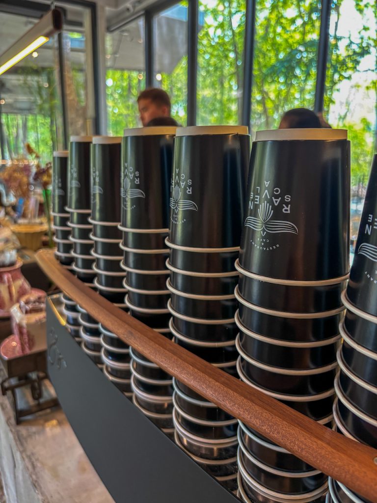 อาคารยกสูงหลังนี้ตกแต่งด้วยกระจกโปร่งรอบด้าน สถาปัตยกรรมแบบปูนดิบ ตัดกับโครงเหล็กสีดำ สำหรับเรา ความโดดเด่นของ Ravenscale อยู่ที่การจัดวางพื้นที่ภายในและภายนอก ช่องลมและช่องแสง ทำให้คาเฟ่แห่งนี้ดูมีเลเยอร์ที่น่าสนใจ