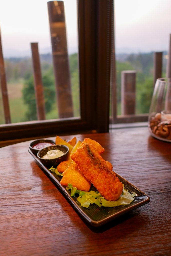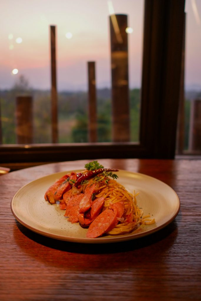 อาหารของ Kuni Kuni เน้นเมนูฝรั่ง และเมนูย่างฟืน (Firewood Grill) เราสั่ง Grill Chicken skewer ไก่ย่างเสียบไม้, Fish & Chip, Green Salad และ Spaghetti sausage มาชิม รสชาติอาหารรวมๆพอใช้ได้ เมนูย่างและทอดดี แต่สปาเก็ตตี้เส้นหนืด และรสจืดไปนิด ต้องกินคู่กับไส้กรอกจึงจะเพิ่มความอร่อย